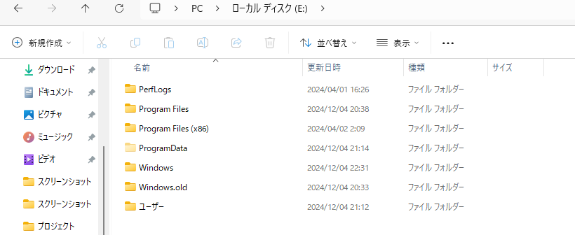 - E:ドライブに割り当てられたパーティションをエクスプローラーで確認し、不要なWindows関連フォルダやファイル(例: Windows、Program Files)を特定しました。