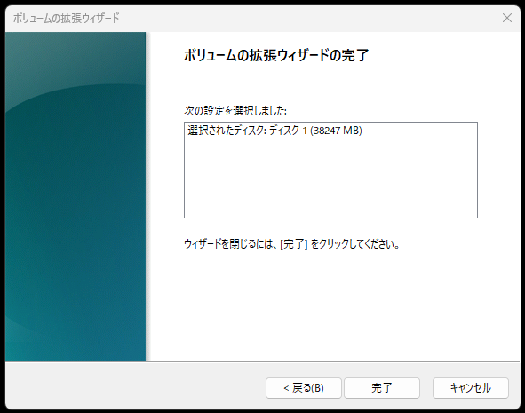 内容に問題がなければ「完了」をクリックして拡張を実行します。ディスク1が正常に拡張結合され、容量もアップしました。