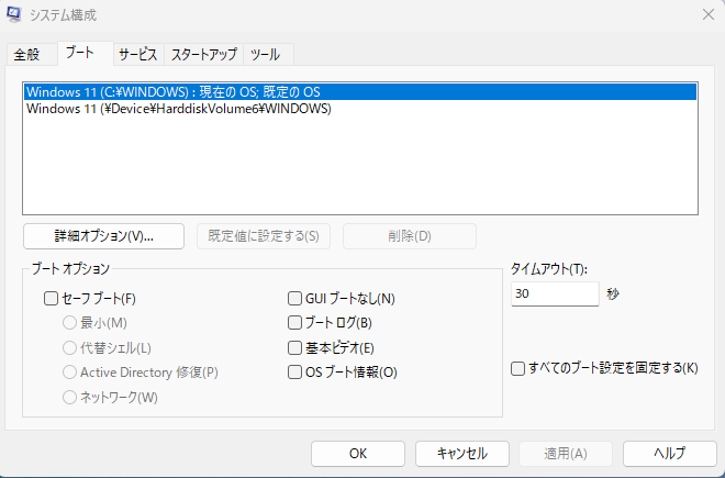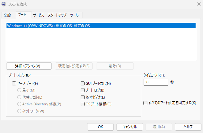 システム構成のブートタブからの場合です。プロンプト、または検索ボックスで「msconfig」と入力し、システム構成を開きます。「ブート」タブを選択します。