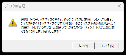 この時はいいえを選択して別の方法をとります。サードパーティ製ツール(例: AOMEI Partition Assistant、MiniTool Partition Wizard、EaseUS Partition Master)を使用