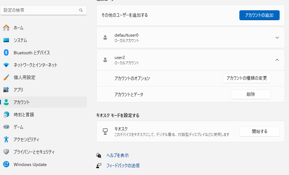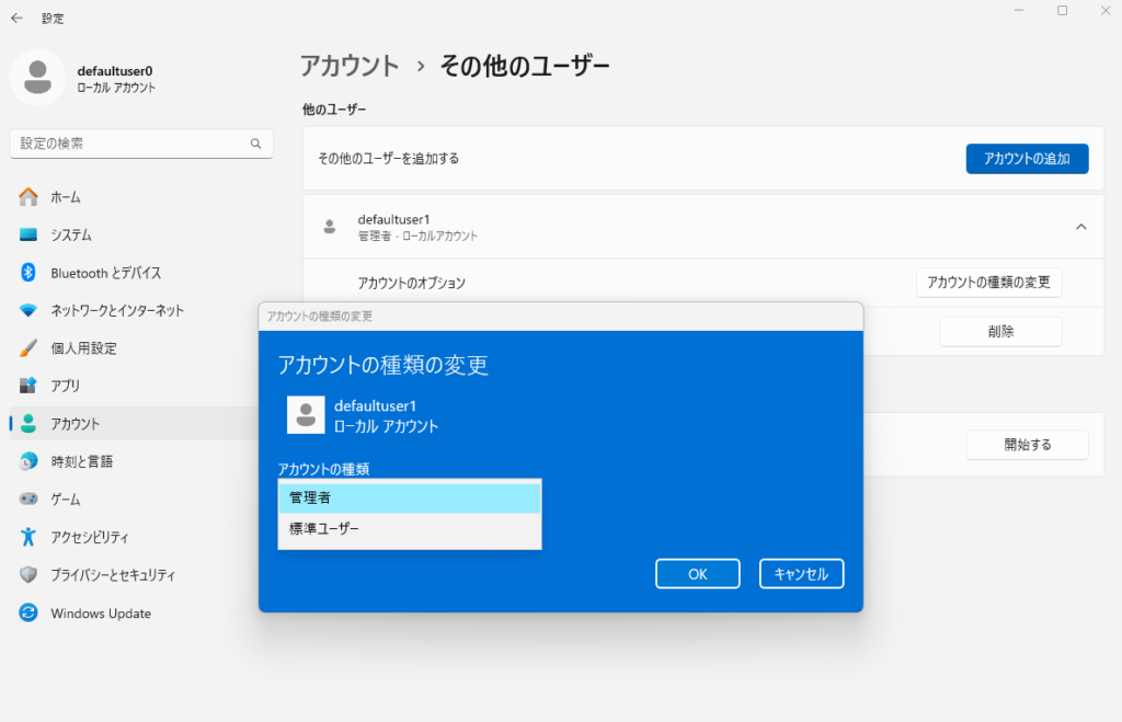 - 新しいアカウントはデフォルトで「標準ユーザー」として作成されるため、管理者アカウントと同じ操作ができません。