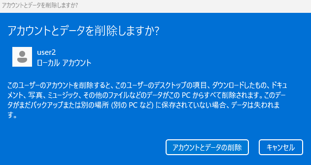フォルダ例: C:\Users\user2 が削除されます。 - user1のアカウント: