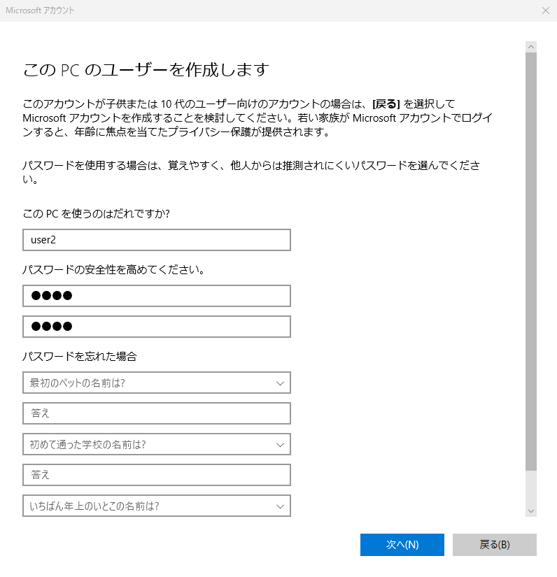 - ユーザー名、パスワード、質問の答えを3つ。それぞれ入力して次へをクリックして下さい。