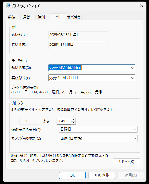 | dddd, yyyy年M月d日 | 土曜日, 2025年5月17日 | 英語表示も可(設定次第) |