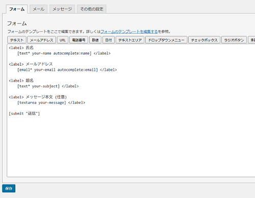 • すでに基本的なフォームのテンプレート(氏名・メールアドレス・題名・メッセージ本文)が用意されています。