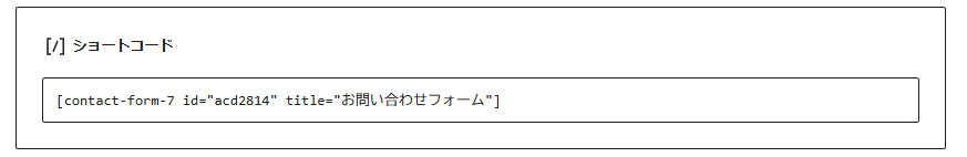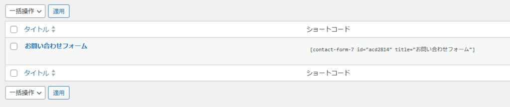• 保存後、画面の上部にショートコードが表示されます。コンタクトフォームの作成一覧でも見れます。(例:[[contact-form-7 id=”123″ title=”お問い合わせフォーム”]])