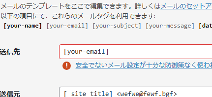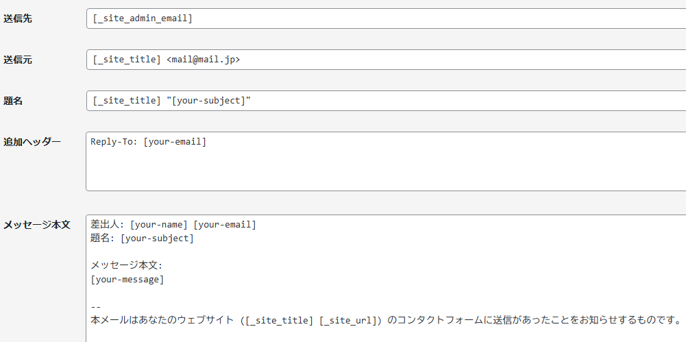• 送信者へ返信できるようにするには、追加ヘッダーに Reply-To: [your-email] を設定