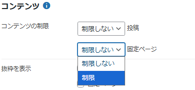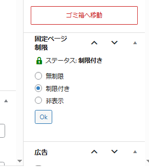 - 記事の編集画面では、固定ページごとに「無制限」「制限付き」「非表示」を選択できます(画像上部)。
